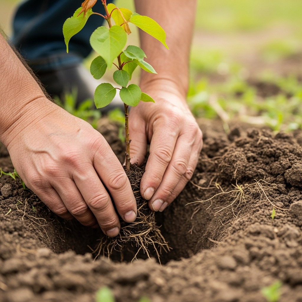 Кўчат марказга жойлаштирилиб, илдизлари яхшилаб ёйилади. Илдиз бўйни ер сатҳида бўлиши керак. Экилгандан сўнг тупроқ шиббаланади ва мўл-кўл суғорилади. Дарахтлар орасидаги масофа камида 3 метр бўлиши керак.