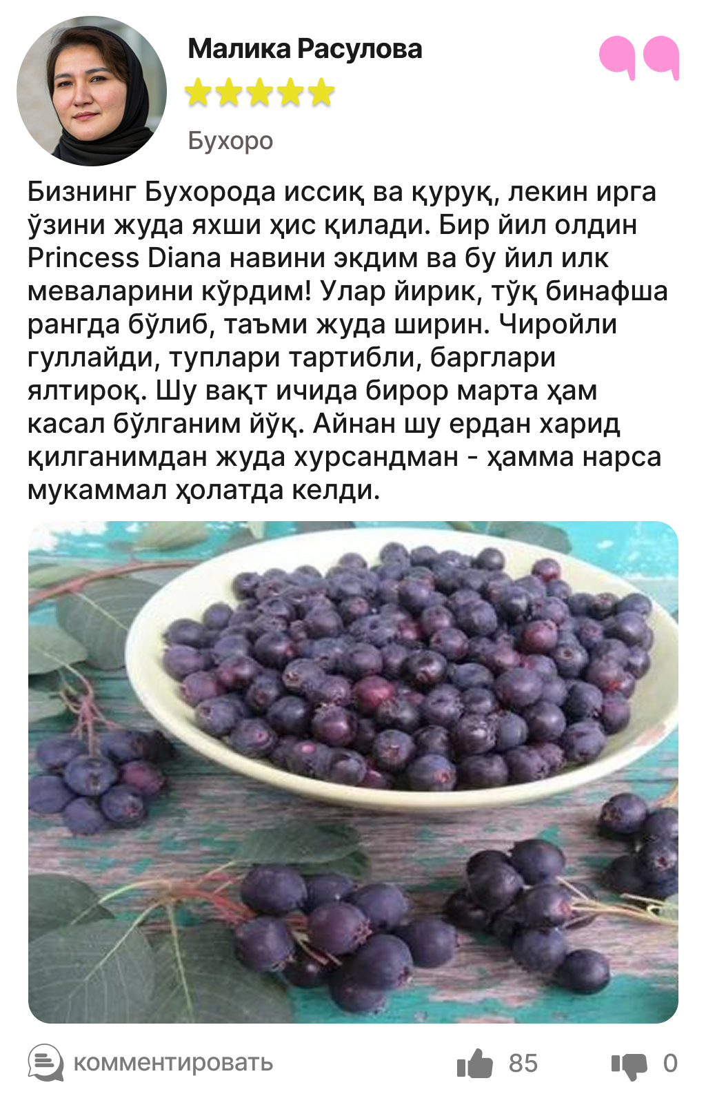 Харидорларимиз сотиб олинган ва етиштирилган ирга кўчатлари ҳақидаги таассуротлари билан ўртоқлашмоқда.