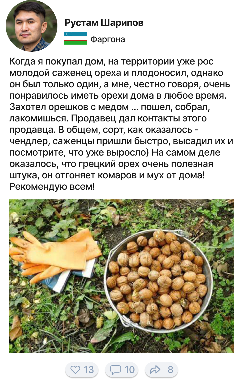 Грецкий орех — очень ценный вид дерева, и мы часто не понимаем, что растет у нас под ногами, каким богатством мы обладаем. Грецкий орех очень часто используют в производстве дорогой мебели, орех имеет очень красивый цвет и структуру дерева. Я с семьей выращиваю орехи на продажу уже более 20 лет. 5 лет назад мы начали продавать ореховые саженцы нашим клиентам и каждый раз радуемся, когда им удается вырастить собственные ореховые сады!
