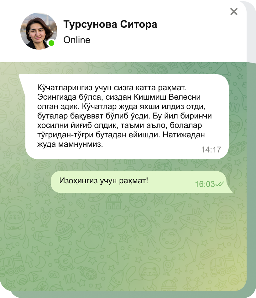 Зарарли кимёвий ўғитлар ва пестицидлардан фойдаланмасдан етиштирилган кўчатларимиз боғингизнинг табиий тозалиги ва саломатлигини сақлайди.